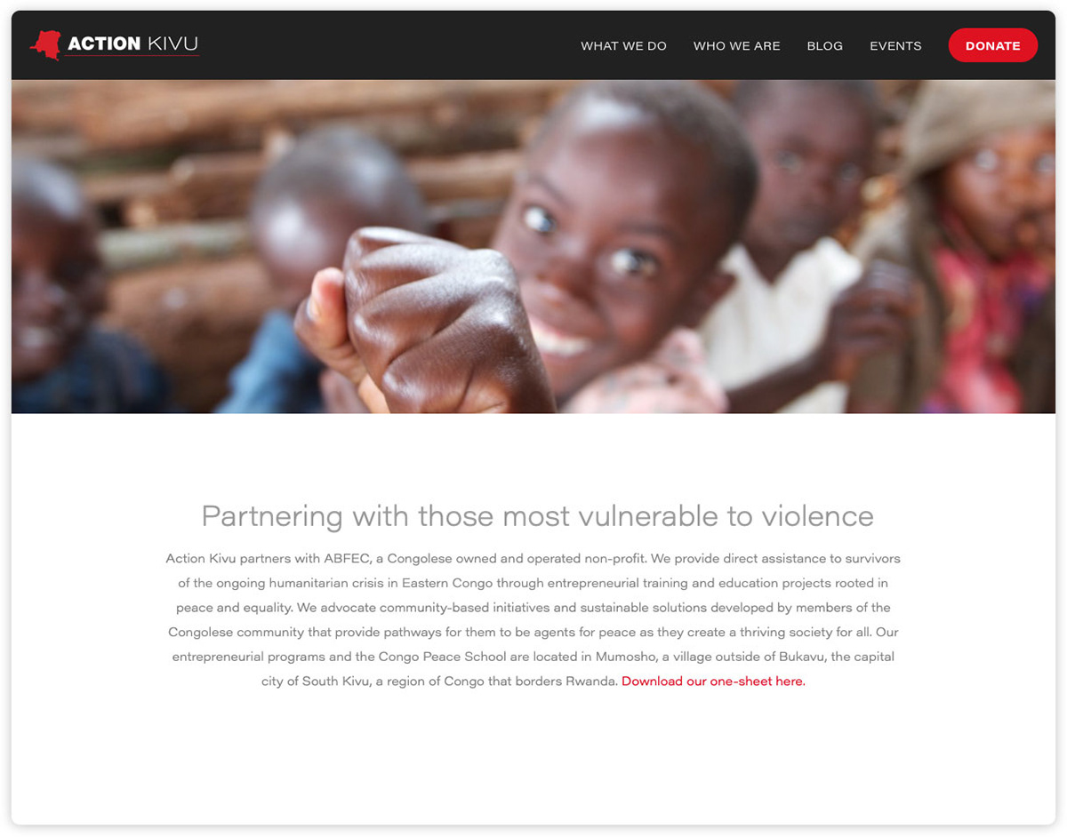 From a design standpoint, this is a fairly straightforward website — deliberately so. The chief communication priority was to tell Action Kivu’s story succinctly while striking a tonal balance between its mission’s sober reality and hopeful progress.